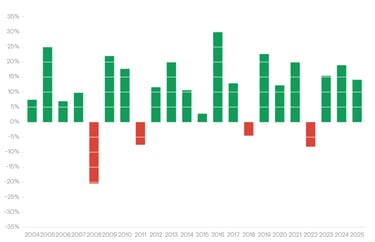 Nos últimos 22 anos, o mercado global teve retorno negativo em apenas 4 ocasiões: 2008, 2011, 2018 e 2022.