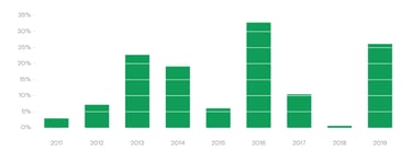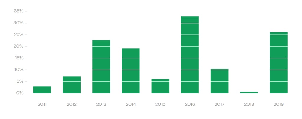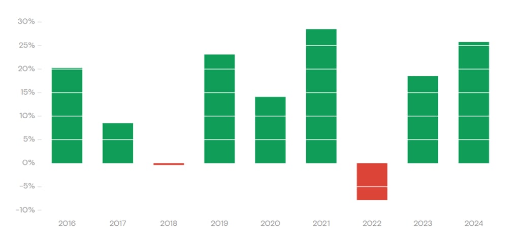 34% em 2016, 10% em 2017, 0,9% em 2018, 27% em 2019, 14% em 2020, 30% em 2021, -8% em 2022, 19% em 2023 e 26% em 2024.