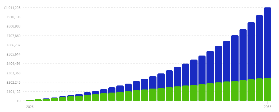 Esse gráfico mostra o crescimento de patrimônio de uma pessoa que investe 700 libras, todos os meses, durante 30 anos.